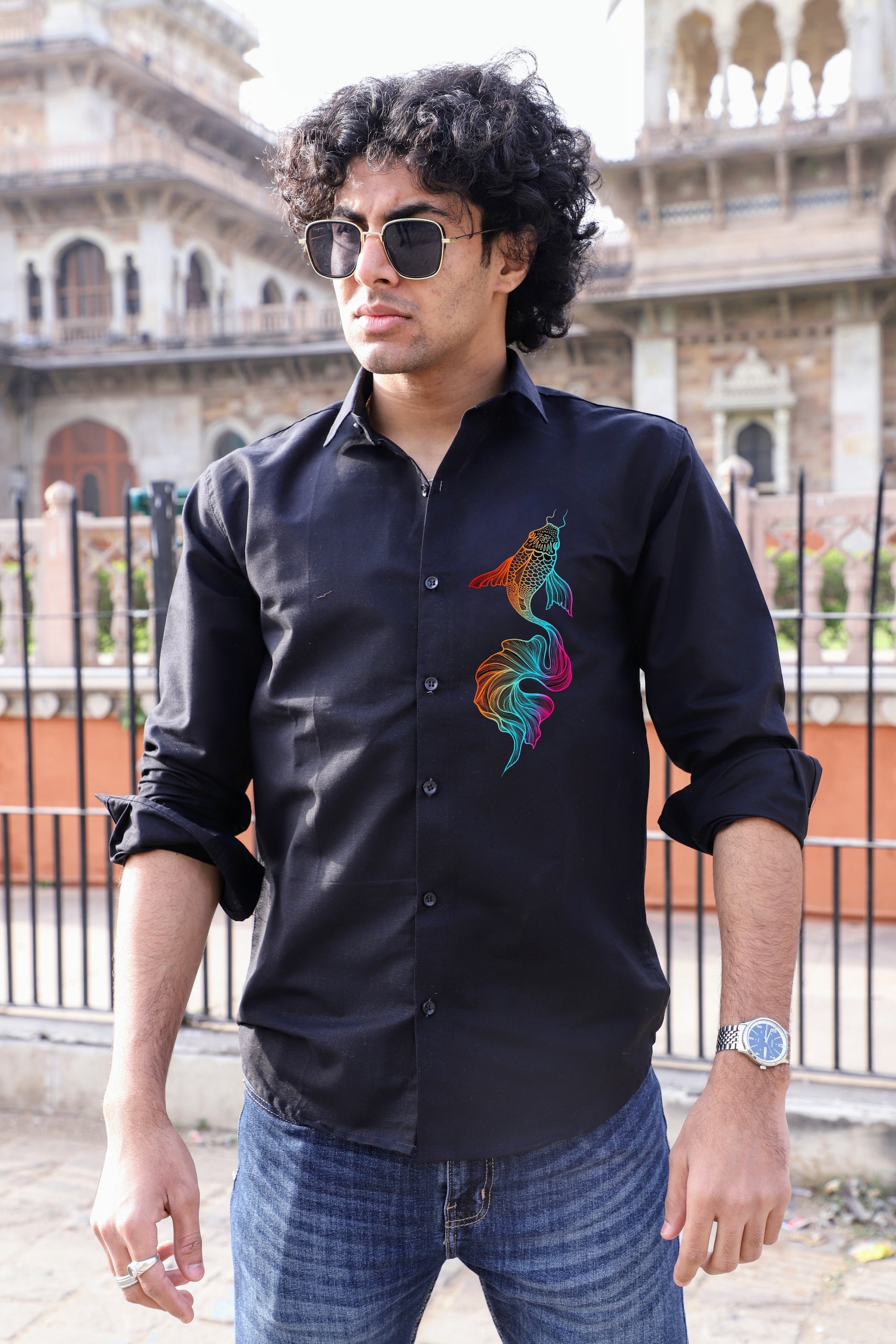 Colourful Fish Printed Black Shirt